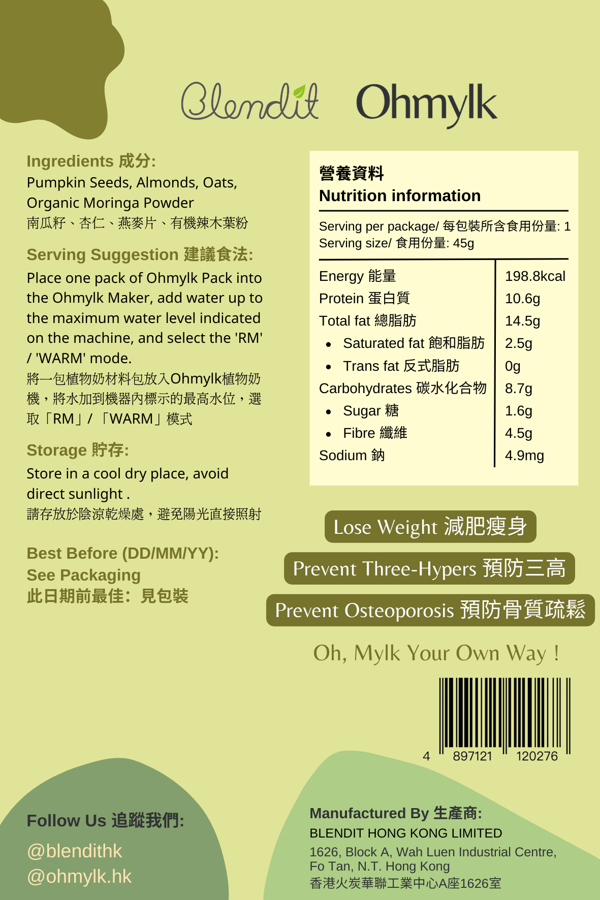 This Ohmylk ingredient pack combines pumpkin seeds🎃, oats🌾, almonds🌰, and moringa leaf powder🍃, with a flavor similar to matcha🍵